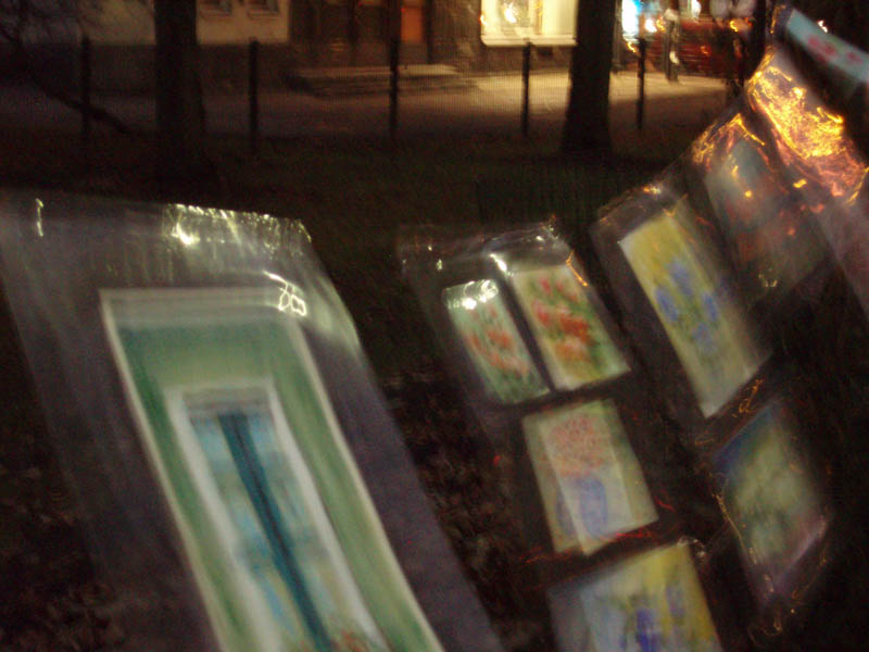Esillä oli laminoituja maalauksia ja piirustuksia,