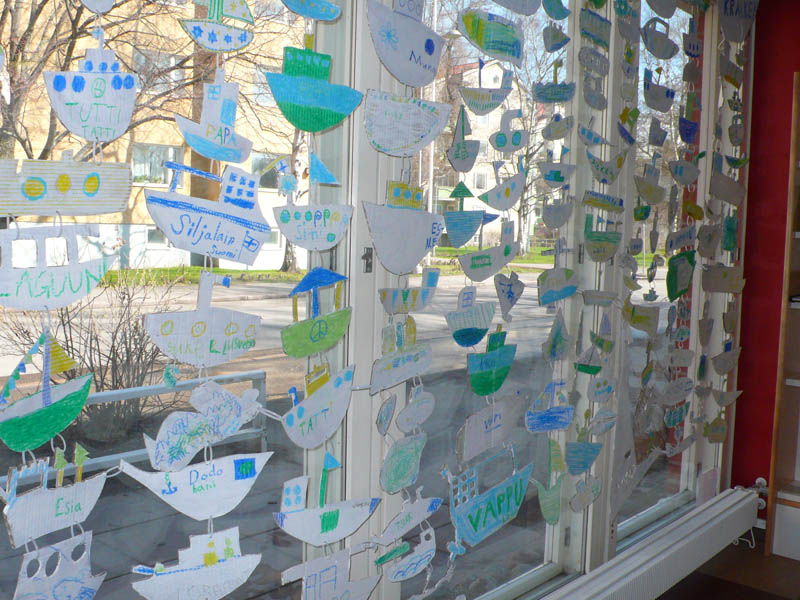 Tässä lasten kanssa tehty Laivaparvi Lauttasaaren kirjastossa